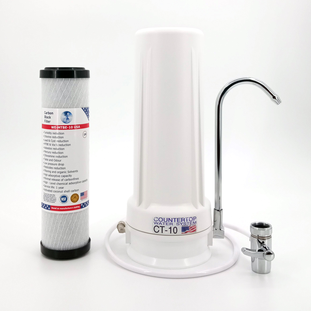 Η συσκευή άνω πάγκου WE-CT1W-10 USA καταλαμβάνει ελάχιστο χώρο στον πάγκο της κουζίνας σας. Σας προσφέρει προστασία από μια σειρά μολυσματικών παραγόντων του νερού βρύσης, όπως  χλώριο, κύστες, χλωραμίνη, αμίαντο, μόλυβδο, MTBE*, κακή γεύση και οσμή του χλωρίου, φαινόλες, σκουριά, χώμα,  θολότητα, υδράργυρο, φυτοφάρμακα κλπ.
