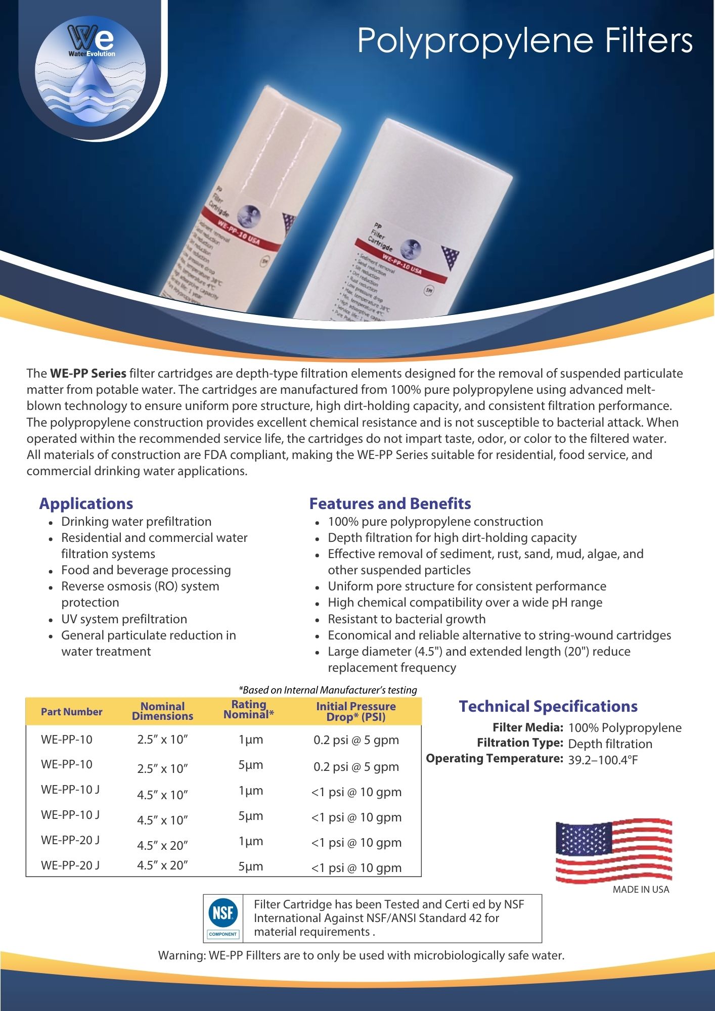 Το ανταλλακτικό φίλτρο στερεών σωματιδίων WE-PP-10 USA 1μm κατασκευάζεται από ίνες πολυπροπυλενίου. Τοποθετείτε σαν πρώτο και βασικό στάδιο σε συστήματα κεντρικής παροχής όπως και σαν προ-φίλτρο σε συστήματα άνω και κάτω πάγκου ή αντίστροφης ώσμωσης. Αφαιρεί αποτελεσματικά από το νερό χώμα, σκουριά, άμμο, λάσπη, μικροσωματίδια, θολότητα, εξασφαλίζοντας ασφαλές και πεντακάθαρο πόσιμο νερό. Το φιλτραρισμένο νερό διατηρεί όλα τα απαραίτητα για την υγεία μεταλλικά του στοιχεία.